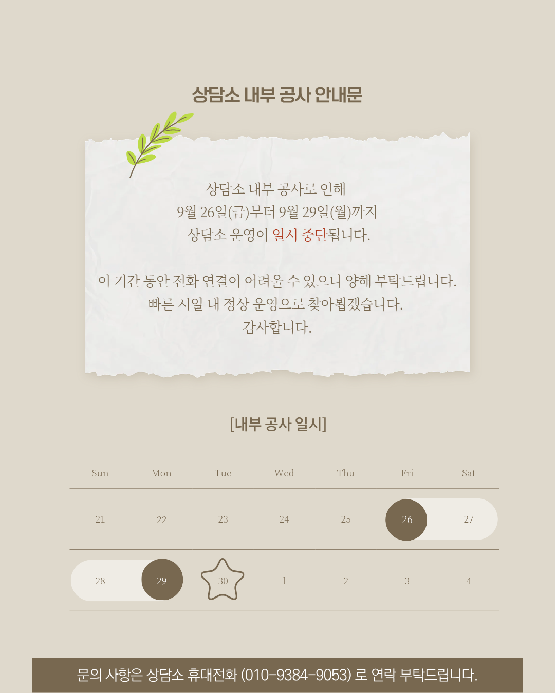 상담소 내부 공사로 인해 9월 26일(금)부터 9월 29일(월)까지 상담소 운영이 일시 중단됩니다.